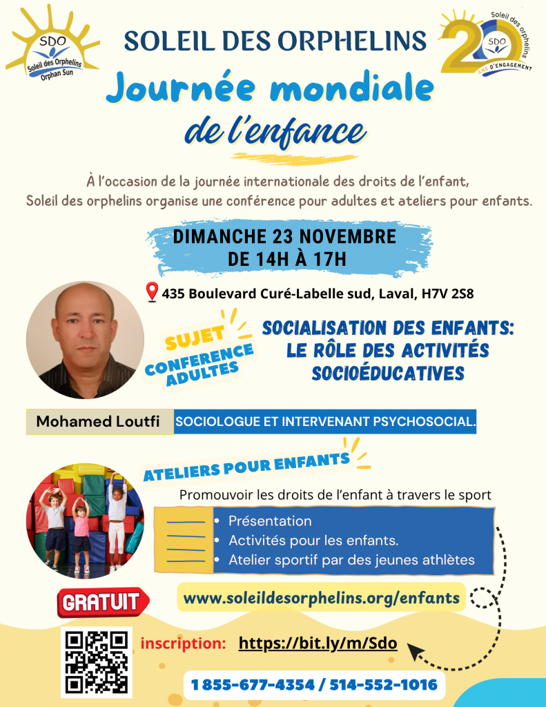 Chaque année, la Journée nationale de l’enfant est célébrée le 20 novembre par Soleil des orphelins. Cette journée vise à célébrer les enfants en tant qu’acteurs à la fois dans de leur propre vie et au sein de leur collectivité, ainsi qu’en étant citoyens actifs pouvant et devant contribuer de façon significative à la prise de décisions.
